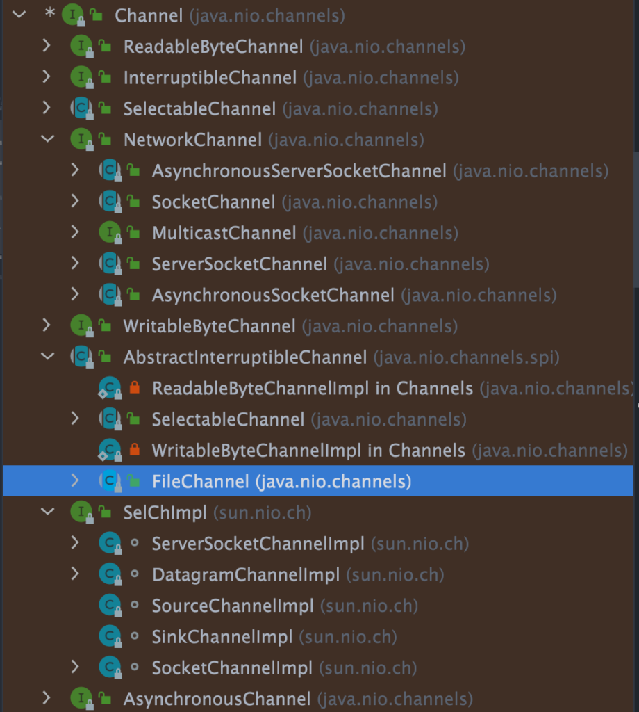 FileChannel:文件访问通道;SocketChannel、ServerSocketChannel:TCP 通信通道;DatagramChannel:UDP 通信通道;